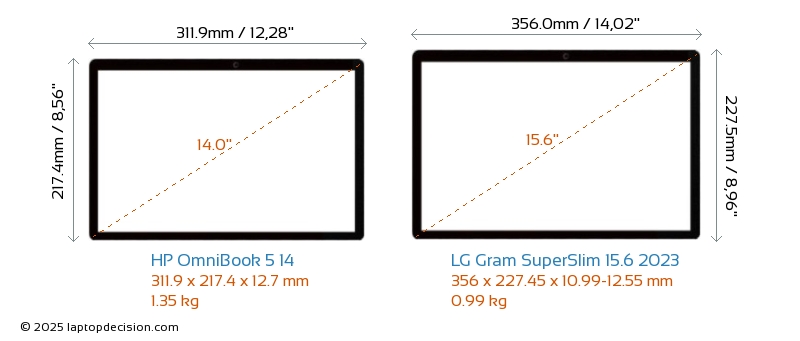 HDMINeither OmniBook 5 14 nor Gram SuperSlim 15.6 2023 has an HDMI port for connecting to external monitors. Aucun des deux OmniBook 5 14 ni Gram SuperSlim 15.6 2023 n'a de port HDMI pour se connecter à des moniteurs externes.