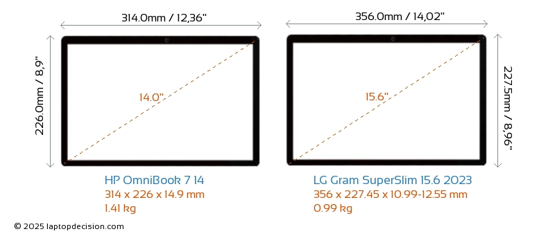 HDMI OmniBook 7 14 dispose d'un port HDMI (1x HDMI 2.1) pour se connecter à des moniteurs externes. Gram SuperSlim 15.6 2023 n'a pas de port HDMI.