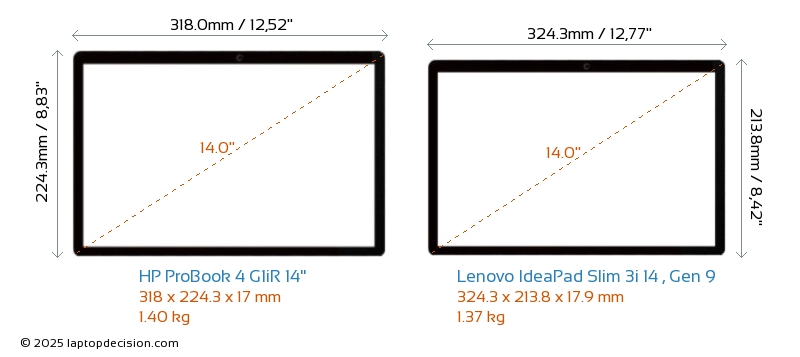 HDMILes deux ProBook 4 G1iR 14" et IdeaPad Slim 3i 14 , Gen 9 disposent d'un port HDMI. ProBook 4 G1iR 14" offre 1x HDMI 2.1, tandis que IdeaPad Slim 3i 14 , Gen 9 offre 1x HDMI 1.4.