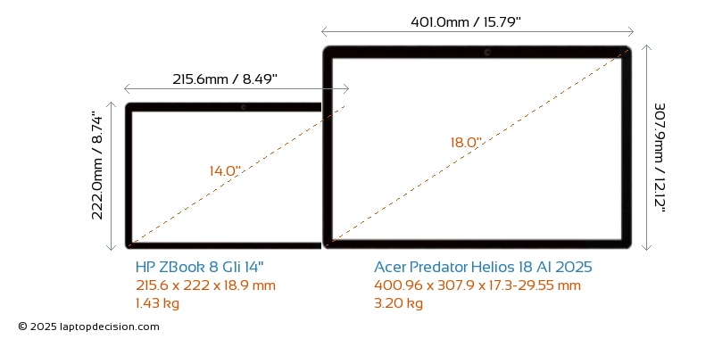 USBLes deux ZBook 8 G1i 14" et Predator Helios 18 AI 2025 disposent de ports USB-A. ZBook 8 G1i 14" dispose de 2x USB 3.2 ports USB-A, tandis que Predator Helios 18 AI 2025 en dispose de 3x USB 3.2.Les deux ZBook 8 G1i 14" et Predator Helios 18 AI 2025 disposent de ports USB Type-C. ZBook 8 G1i 14" dispose de 3x USB 4.0 ports USB Type-C, tandis que Predator Helios 18 AI 2025 en dispose de 2x USB 4.0.