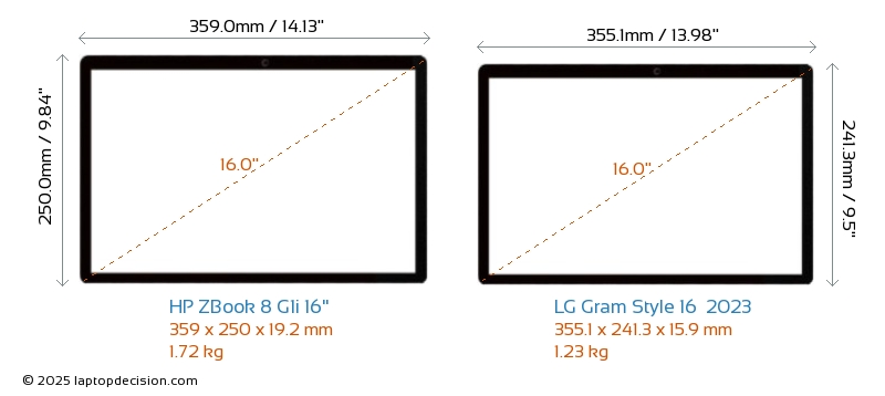 HDMI ZBook 8 G1i 16" dispose d'un port HDMI (1x HDMI 2.1) pour se connecter à des moniteurs externes. Gram Style 16 2023 n'a pas de port HDMI.
