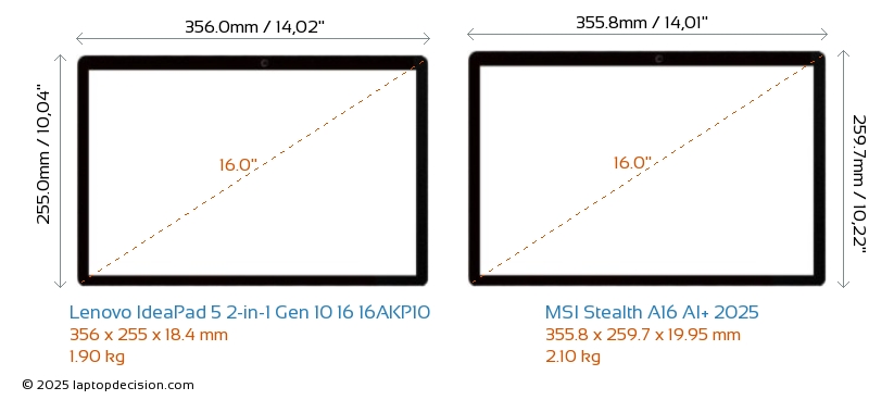 HDMILes deux IdeaPad 5 2-in-1 Gen 10 16 16AKP10 et Stealth A16 AI+ 2025 disposent d'un port HDMI. IdeaPad 5 2-in-1 Gen 10 16 16AKP10 offre 1x HDMI 1.4, tandis que Stealth A16 AI+ 2025 offre 1x HDMI 2.1.