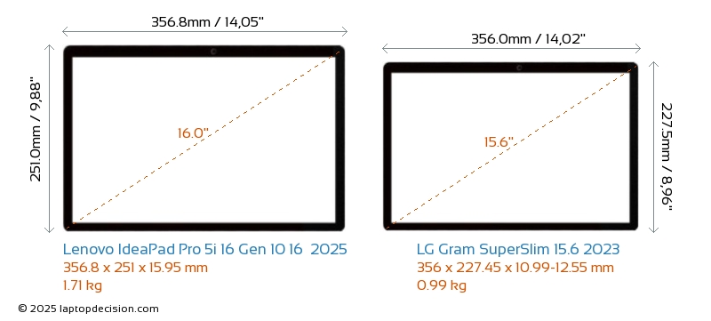 HDMI IdeaPad Pro 5i 16 Gen 10 16 2025 dispose d'un port HDMI (1x HDMI 2.1) pour se connecter à des moniteurs externes. Gram SuperSlim 15.6 2023 n'a pas de port HDMI.
