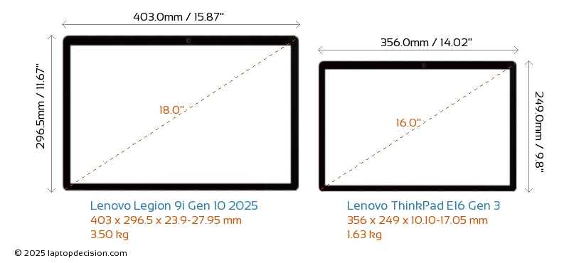 USBLes deux Legion 9i Gen 10 2025 et ThinkPad E16 Gen 3 disposent de ports USB-A. Legion 9i Gen 10 2025 dispose de 3x USB 3.2 ports USB-A, tandis que ThinkPad E16 Gen 3 en dispose de 2x USB 3.2.Les deux Legion 9i Gen 10 2025 et ThinkPad E16 Gen 3 disposent de ports USB Type-C. Legion 9i Gen 10 2025 dispose de 3x USB 4.0 ports USB Type-C, tandis que ThinkPad E16 Gen 3 en dispose de 2x USB 4.0.