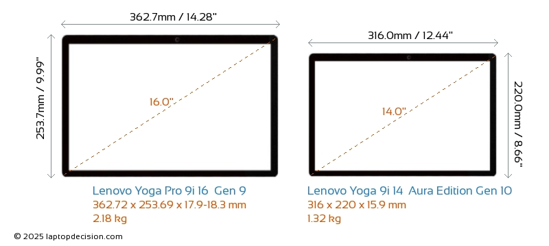 HDMI Yoga Pro 9i 16 Gen 9 dispose d'un port HDMI (1x HDMI 2.1) pour se connecter à des moniteurs externes. Yoga 9i 14 Aura Edition Gen 10 n'a pas de port HDMI.