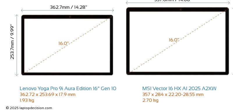 HDMILes deux Yoga Pro 9i Aura Edition 16" Gen 10 et Vector 16 HX AI 2025 A2XW disposent d'un port HDMI (1x HDMI 2.1) pour se connecter à des moniteurs externes.