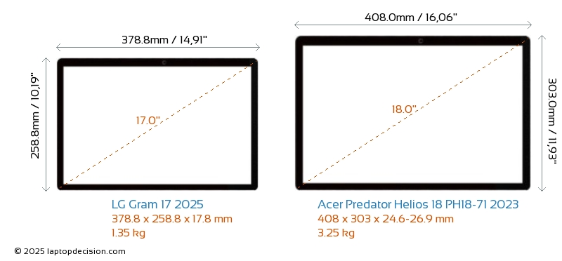 Prise AudioLes deux Gram 17 2025 et Predator Helios 18 PH18-71 2023 sont équipés d'une prise audio de 3,5 mm, permettant une connexion sans interruption aux écouteurs et haut-parleurs.