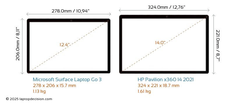 HDMIPavilion x360 14 2021 dispose d'un port HDMI (1x HDMI 2.0) pour se connecter à des moniteurs externes. Surface Laptop Go 3 n'a pas de port HDMI.