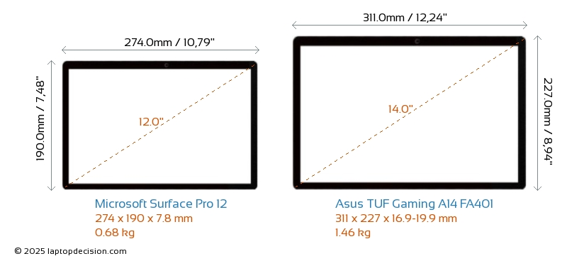 HDMI TUF Gaming A14 FA401 dispose d'un port HDMI (1x HDMI 2.1) pour se connecter à des moniteurs externes. Surface Pro 12 n'a pas de port HDMI.