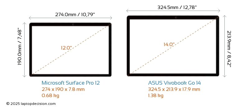 HDMI Vivobook Go 14 dispose d'un port HDMI (1x HDMI 1.4) pour se connecter à des moniteurs externes. Surface Pro 12 n'a pas de port HDMI.