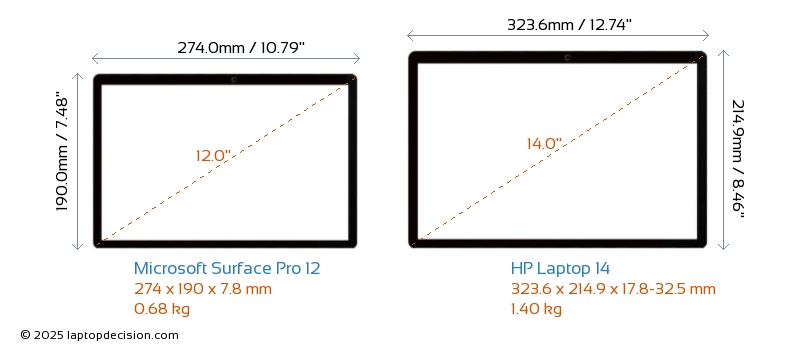 HDMI Laptop 14 dispose d'un port HDMI (1x HDMI 1.4) pour se connecter à des moniteurs externes. Surface Pro 12 n'a pas de port HDMI.