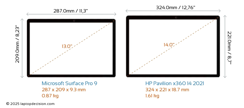 HDMIPavilion x360 14 2021 dispose d'un port HDMI (1x HDMI 2.0) pour se connecter à des moniteurs externes. Surface Pro 9 n'a pas de port HDMI.