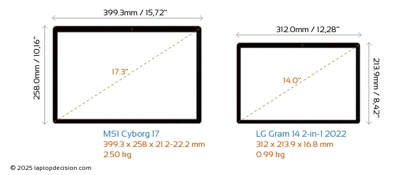 USBLes deux Cyborg 17 et Gram 14 2-in-1 2022 disposent de 2x USB 3.2 ports USB-A.Les deux Cyborg 17 et Gram 14 2-in-1 2022 disposent de ports USB Type-C. Cyborg 17 dispose de 1x USB 3.2 ports USB Type-C, tandis que Gram 14 2-in-1 2022 en dispose de 2x USB 4.0.