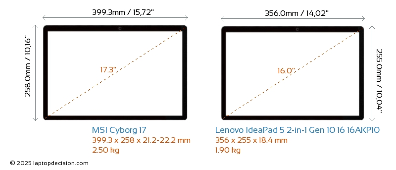 HDMILes deux Cyborg 17 et IdeaPad 5 2-in-1 Gen 10 16 16AKP10 disposent d'un port HDMI. Cyborg 17 offre 1x HDMI 2.1, tandis que IdeaPad 5 2-in-1 Gen 10 16 16AKP10 offre 1x HDMI 1.4.