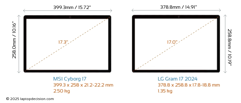 USBLes deux Cyborg 17 et Gram 17 2024 disposent de 2x USB 3.2 ports USB-A.Les deux Cyborg 17 et Gram 17 2024 disposent de ports USB Type-C. Cyborg 17 dispose de 1x USB 3.2 ports USB Type-C, tandis que Gram 17 2024 en dispose de 2x USB 4.0.