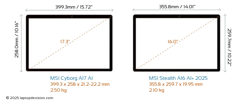 USBLes deux Cyborg A17 AI et Stealth A16 AI+ 2025 disposent de 2x USB 3.2 ports USB-A.Les deux Cyborg A17 AI et Stealth A16 AI+ 2025 disposent de ports USB Type-C. Cyborg A17 AI dispose de 1x USB 3.2 ports USB Type-C, tandis que Stealth A16 AI+ 2025 en dispose de 1x USB 4.0.