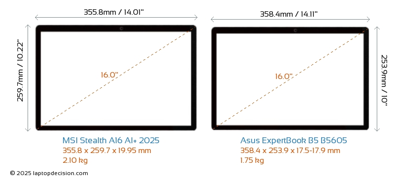 USBLes deux Stealth A16 AI+ 2025 et ExpertBook B5 B5605 disposent de 2x USB 3.2 ports USB-A.Les deux Stealth A16 AI+ 2025 et ExpertBook B5 B5605 disposent de ports USB Type-C. Stealth A16 AI+ 2025 dispose de 1x USB 4.0 ports USB Type-C, tandis que ExpertBook B5 B5605 en dispose de 2x USB 4.0.