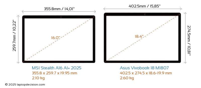 HDMILes deux Stealth A16 AI+ 2025 et Vivobook 18 M1807 disposent d'un port HDMI (1x HDMI 2.1) pour se connecter à des moniteurs externes.