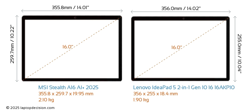USBLes deux Stealth A16 AI+ 2025 et IdeaPad 5 2-in-1 Gen 10 16 16AKP10 disposent de 2x USB 3.2 ports USB-A.Les deux Stealth A16 AI+ 2025 et IdeaPad 5 2-in-1 Gen 10 16 16AKP10 disposent de ports USB Type-C. Stealth A16 AI+ 2025 dispose de 1x USB 4.0 ports USB Type-C, tandis que IdeaPad 5 2-in-1 Gen 10 16 16AKP10 en dispose de 2x USB 4.0.