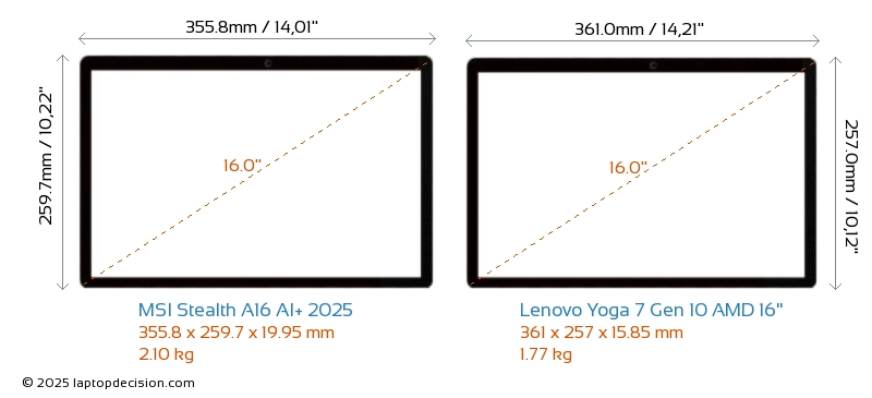 USBLes deux Stealth A16 AI+ 2025 et Yoga 7 Gen 10 AMD 16" disposent de ports USB-A. Stealth A16 AI+ 2025 dispose de 2x USB 3.2 ports USB-A, tandis que Yoga 7 Gen 10 AMD 16" en dispose de 1x USB 3.2.Les deux Stealth A16 AI+ 2025 et Yoga 7 Gen 10 AMD 16" disposent de ports USB Type-C. Stealth A16 AI+ 2025 dispose de 1x USB 4.0 ports USB Type-C, tandis que Yoga 7 Gen 10 AMD 16" en dispose de 2x USB 4.0.