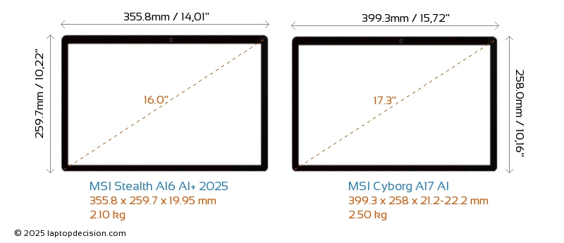 USBLes deux Stealth A16 AI+ 2025 et Cyborg A17 AI disposent de 2x USB 3.2 ports USB-A.Les deux Stealth A16 AI+ 2025 et Cyborg A17 AI disposent de ports USB Type-C. Stealth A16 AI+ 2025 dispose de 1x USB 4.0 ports USB Type-C, tandis que Cyborg A17 AI en dispose de 1x USB 3.2.