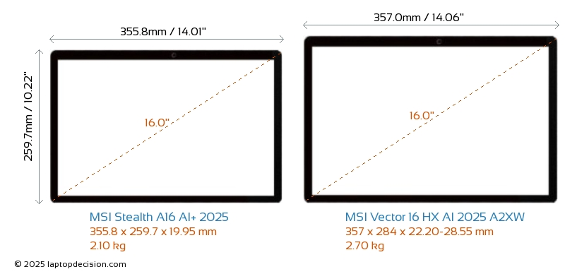 USBLes deux Stealth A16 AI+ 2025 et Vector 16 HX AI 2025 A2XW disposent de 2x USB 3.2 ports USB-A.Les deux Stealth A16 AI+ 2025 et Vector 16 HX AI 2025 A2XW disposent de ports USB Type-C. Stealth A16 AI+ 2025 dispose de 1x USB 4.0 ports USB Type-C, tandis que Vector 16 HX AI 2025 A2XW en dispose de 2x USB 4.0.