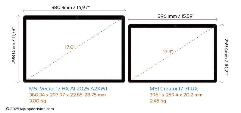HDMILes deux Vector 17 HX AI 2025 A2XWJ et Creator 17 B11UX disposent d'un port HDMI (1x HDMI 2.1) pour se connecter à des moniteurs externes.