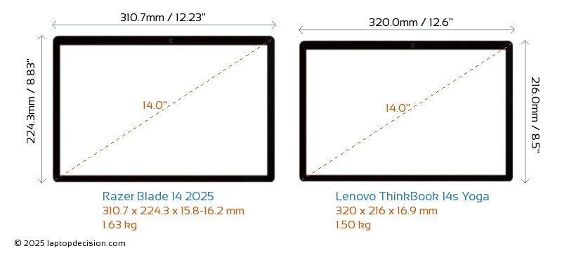 USBLes deux Blade 14 2025 et ThinkBook 14s Yoga disposent de 2x USB 3.2 ports USB-A.Les deux Blade 14 2025 et ThinkBook 14s Yoga disposent de 2x USB 4.0 ports USB Type-C.