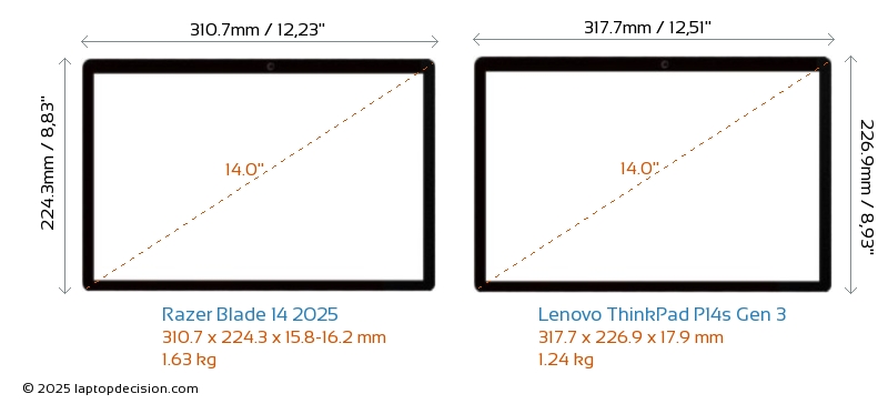 USBLes deux Blade 14 2025 et ThinkPad P14s Gen 3 disposent de 2x USB 3.2 ports USB-A.Les deux Blade 14 2025 et ThinkPad P14s Gen 3 disposent de ports USB Type-C. Blade 14 2025 dispose de 2x USB 4.0 ports USB Type-C, tandis que ThinkPad P14s Gen 3 en dispose de 2x USB 3.2.
