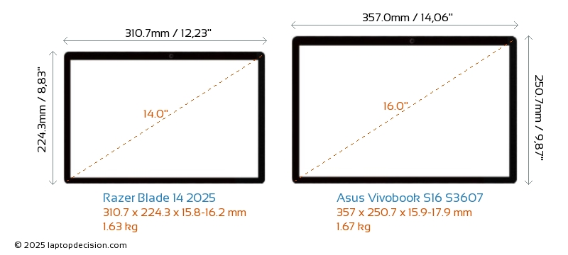 USBLes deux Blade 14 2025 et Vivobook S16 S3607 disposent de 2x USB 3.2 ports USB-A.Les deux Blade 14 2025 et Vivobook S16 S3607 disposent de 2x USB 4.0 ports USB Type-C.