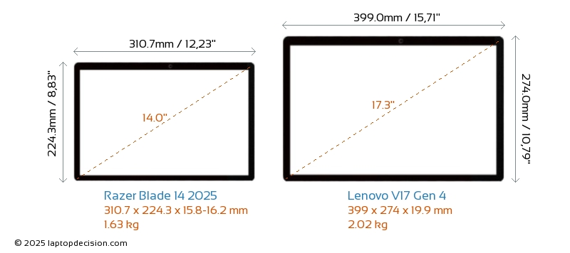 USBLes deux Blade 14 2025 et V17 Gen 4 disposent de 2x USB 3.2 ports USB-A.Les deux Blade 14 2025 et V17 Gen 4 disposent de ports USB Type-C. Blade 14 2025 dispose de 2x USB 4.0 ports USB Type-C, tandis que V17 Gen 4 en dispose de 1x USB 3.2.