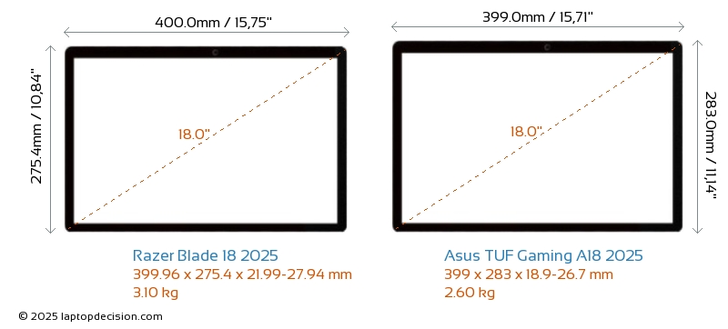 USBLes deux Blade 18 2025 et TUF Gaming A18 2025 disposent de 3x USB 3.2 ports USB-A.Les deux Blade 18 2025 et TUF Gaming A18 2025 disposent de ports USB Type-C. Blade 18 2025 dispose de 2x USB 4.0 ports USB Type-C, tandis que TUF Gaming A18 2025 en dispose de 1x USB 4.0.
