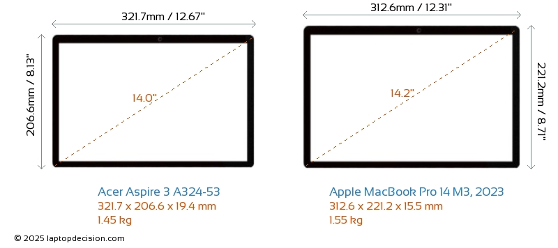 HDMIどちらの Aspire 3 A324-53 と MacBook Pro 14 M3, 2023 も HDMI ポートを備えています。 Aspire 3 A324-53 は 1x HDMI 1.4 を提供し、 MacBook Pro 14 M3, 2023 は 1x HDMI 2.1 を提供します。