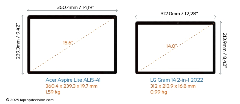 HDMIどちらの Aspire Lite AL15-41 と Gram 14 2-in-1 2022 も HDMI ポートを備えています。 Aspire Lite AL15-41 は 1x HDMI 1.4 を提供し、Gram 14 2-in-1 2022 は 1x HDMI 2.0 を提供します。