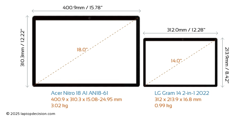 HDMIどちらの Nitro 18 AI AN18-61 と Gram 14 2-in-1 2022 も HDMI ポートを備えています。 Nitro 18 AI AN18-61 は 1x HDMI 2.1 を提供し、Gram 14 2-in-1 2022 は 1x HDMI 2.0 を提供します。