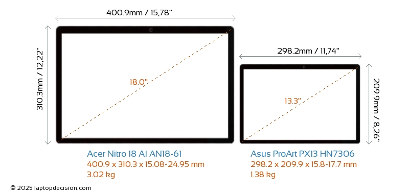 HDMI両方の Nitro 18 AI AN18-61 と ProArt PX13 HN7306 は、外部モニターに接続するための HDMI ポート (1x HDMI 2.1) を備えています。