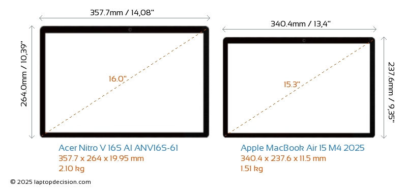 HDMI Nitro V 16S AI ANV16S-61 は、外部モニターに接続するための HDMI ポート (1x HDMI 2.1) を備えています。 MacBook Air 15 M4 2025 には HDMI ポートがありません。