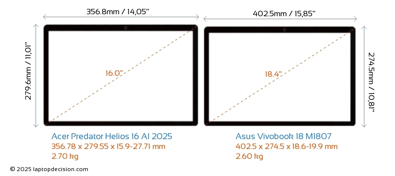 HDMI両方の Predator Helios 16 AI 2025 と Vivobook 18 M1807 は、外部モニターに接続するための HDMI ポート (1x HDMI 2.1) を備えています。