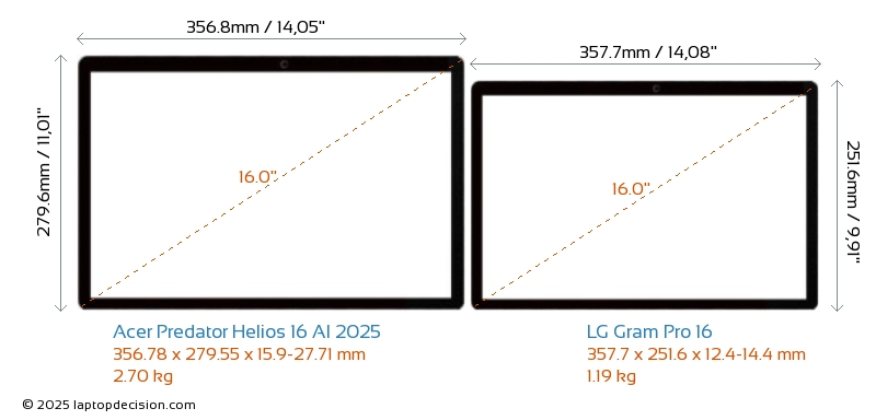 Acer Predator Helios 16 AI 2025 vs LG Gram Pro 16 比較