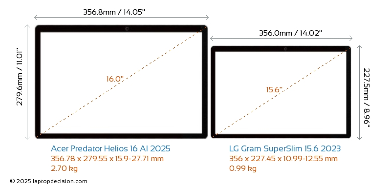 HDMI Predator Helios 16 AI 2025 は、外部モニターに接続するための HDMI ポート (1x HDMI 2.1) を備えています。 Gram SuperSlim 15.6 2023 には HDMI ポートがありません。