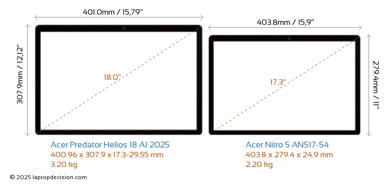 HDMIどちらの Predator Helios 18 AI 2025 と Nitro 5 AN517-54 も HDMI ポートを備えています。 Predator Helios 18 AI 2025 は 1x HDMI 2.1 を提供し、Nitro 5 AN517-54 は 1x HDMI 2.0 を提供します。