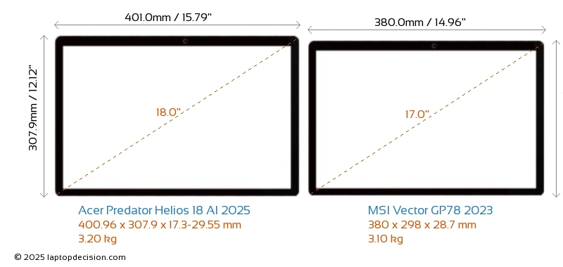 HDMI両方の Predator Helios 18 AI 2025 と Vector GP78 2023 は、外部モニターに接続するための HDMI ポート (1x HDMI 2.1) を備えています。