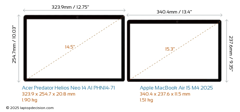 HDMI Predator Helios Neo 14 AI PHN14-71 は、外部モニターに接続するための HDMI ポート (1x HDMI 2.1) を備えています。 MacBook Air 15 M4 2025 には HDMI ポートがありません。