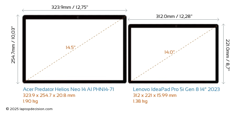HDMIどちらの Predator Helios Neo 14 AI PHN14-71 と IdeaPad Pro 5i Gen 8 14" 2023 も HDMI ポートを備えています。 Predator Helios Neo 14 AI PHN14-71 は 1x HDMI 2.1 を提供し、 IdeaPad Pro 5i Gen 8 14" 2023 は 1x HDMI 2.0 を提供します。