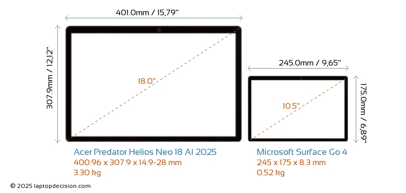 HDMI Predator Helios Neo 18 AI 2025 は、外部モニターに接続するための HDMI ポート (1x HDMI 2.1) を備えています。 Surface Go 4 には HDMI ポートがありません。