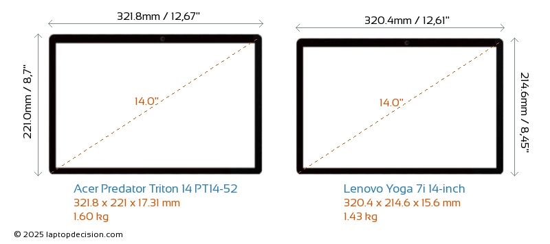 HDMI Predator Triton 14 PT14-52 は、外部モニターに接続するための HDMI ポート (1x HDMI 2.1) を備えています。 Yoga 7i 14-inch には HDMI ポートがありません。