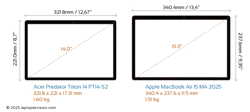 HDMI Predator Triton 14 PT14-52 は、外部モニターに接続するための HDMI ポート (1x HDMI 2.1) を備えています。 MacBook Air 15 M4 2025 には HDMI ポートがありません。