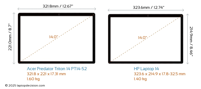 HDMIどちらの Predator Triton 14 PT14-52 と Laptop 14 も HDMI ポートを備えています。 Predator Triton 14 PT14-52 は 1x HDMI 2.1 を提供し、 Laptop 14 は 1x HDMI 1.4 を提供します。