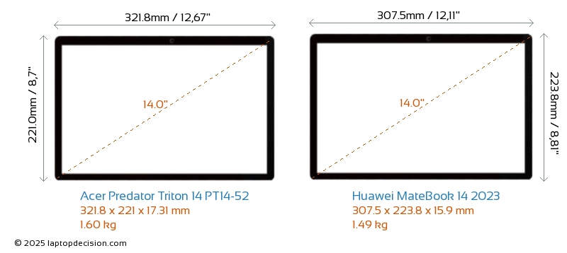 HDMIどちらの Predator Triton 14 PT14-52 と MateBook 14 2023 も HDMI ポートを備えています。 Predator Triton 14 PT14-52 は 1x HDMI 2.1 を提供し、 MateBook 14 2023 は 1x HDMI 2.0 を提供します。