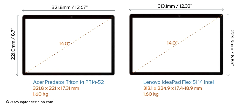 HDMIどちらの Predator Triton 14 PT14-52 と IdeaPad Flex 5i 14 Intel も HDMI ポートを備えています。 Predator Triton 14 PT14-52 は 1x HDMI 2.1 を提供し、 IdeaPad Flex 5i 14 Intel は 1x HDMI 1.4 を提供します。